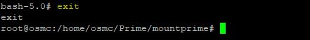 you're now back to your raspberry prompt/tree. if you want to be clean, remove bash binary from /home/osmc/Prime/mountprime/bin, and libtinfo.so.6 from /home/osmc/Prime/mountprime/lib (adapt with your path)