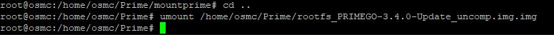 mount # or mount | grep PRI # change folder to be outside of the mount cd /home/osmc/Prime # unmount img file : umount /home/osmc/Prime/rootfs_PRIMEGO-3.4.0-Update_uncomp.img.img