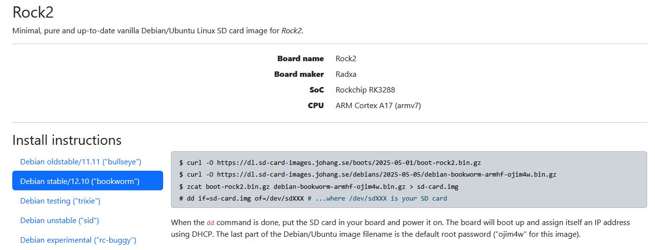 #somewhere where you have empty space : wget https://dl.sd-card-images.johang.se/debians/2025-05-05/debian-bookworm-armhf-ojim4w.bin.gz # As mentioned on the upper site, do the following command to make img file : zcat debian-bookworm-armhf-ojim4w.bin.gz > sd-card.img # Nb : (we dont need rock2 boot gz files)