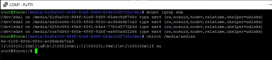 root@force:~# fdisk -l /dev/sda Disk /dev/sda: 29.16 GiB, 31312576512 bytes, 61157376 sectors Disk model: SD Card Reader Units: sectors of 1 * 512 = 512 bytes Sector size (logical/physical): 512 bytes / 512 bytes I/O size (minimum/optimal): 512 bytes / 512 bytes Disklabel type: dos Disk identifier: 0x42706615 Device Boot Start End Sectors Size Id Type /dev/sda1 2048 14682111 14680064 7G 83 Linux /dev/sda2 14682112 31459327 16777216 8G 83 Linux /dev/sda3 31459328 48236543 16777216 8G 83 Linux /dev/sda4 48236544 60522495 12285952 5.9G 83 Linux