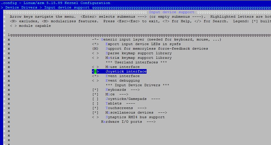As we have the kernel configuration, you can see what features are already in the kernel, and whiches are not. To test kernel viability, i will compile a module which is not there by default , I will do it with “Joystick Interface” :