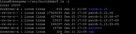cd linux-5.15 /linux-5.15$ patch -p1 < ../patch-5.15.86 /linux-5.15$ cat ../patches/*.patch | patch -p1 /linux-5.15$ patch -p1 < ../patch-5.15.86-87 /linux-5.15$ patch -p1 < ../patch-5.15.87-88 /linux-5.15$ patch -p1 < ../patch-5.15.88-89