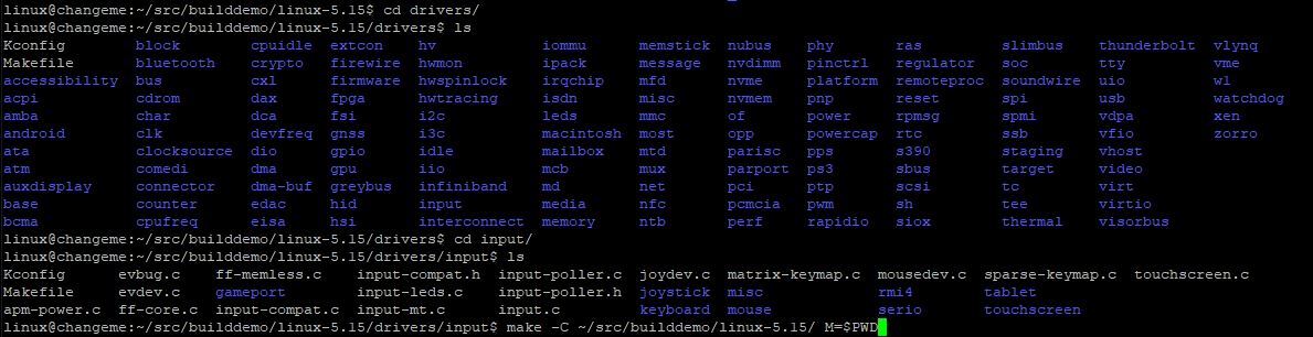 Then go to your module folder in source tree. For joystick module we've checked in kernel config, it's located in /src/builddemo/linux-5.15/drivers/input
