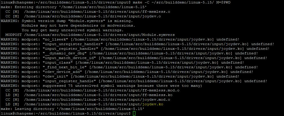 syntax is : make -C <path_to_kernel_dir> M=$PWD so i do : ~/src/builddemo/linux-5.15/drivers/input$ make -C ~/src/builddemo/linux-5.15/ M=$PWD