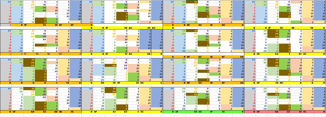 you have to lit pixel 2 to pixel 8 , so i do : 1+2+4+8+10+20+40 = 70 + 15 (15 in hex is F ) ⇒ 7F, that's the first Byte.