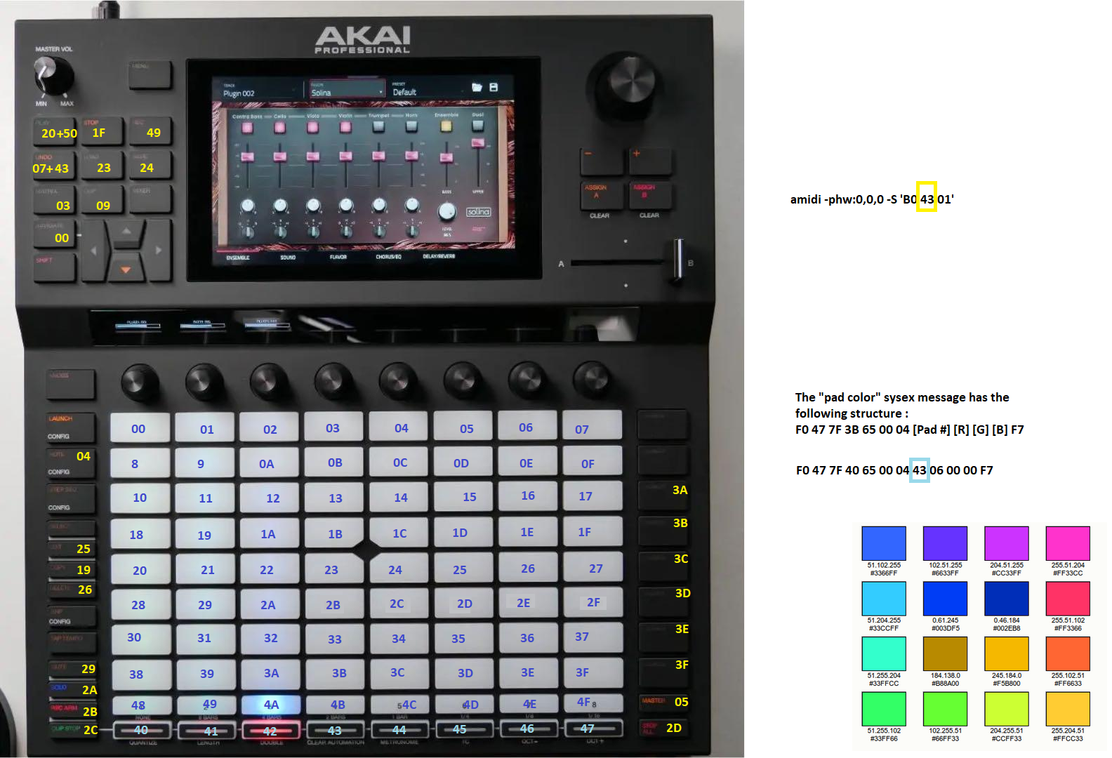 low intensity on pad amidi -phw:0,0,0 -S 'F0 47 7F 40 65 00 04 33 01 01 01 F7' mid intensity on pad amidi -phw:0,0,0 -S 'F0 47 7F 40 65 00 04 33 11 11 11 F7' higher intensity on pad amidi -phw:0,0,0 -S 'F0 47 7F 40 65 00 04 33 21 21 21 F7'
